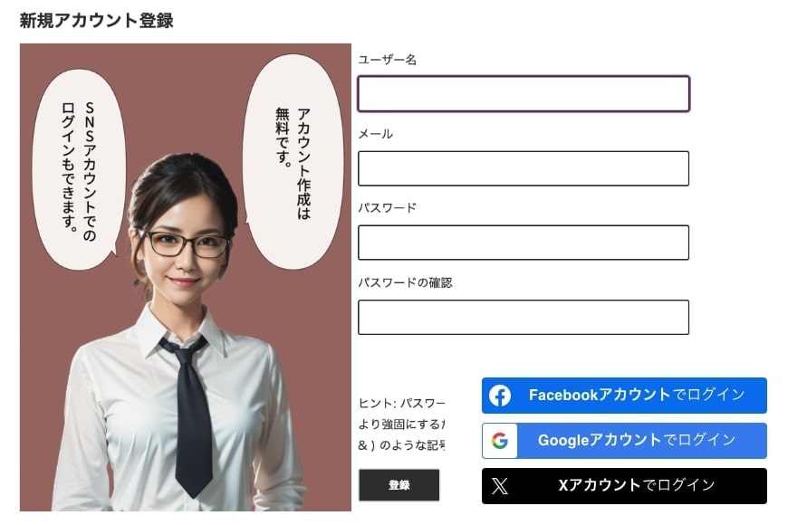 上部メニュー「新規ユーザー登録」をクリックします。メールアドレスとパスワードで登録いただくか、SNSアカウントでも即ログインしていただけます。