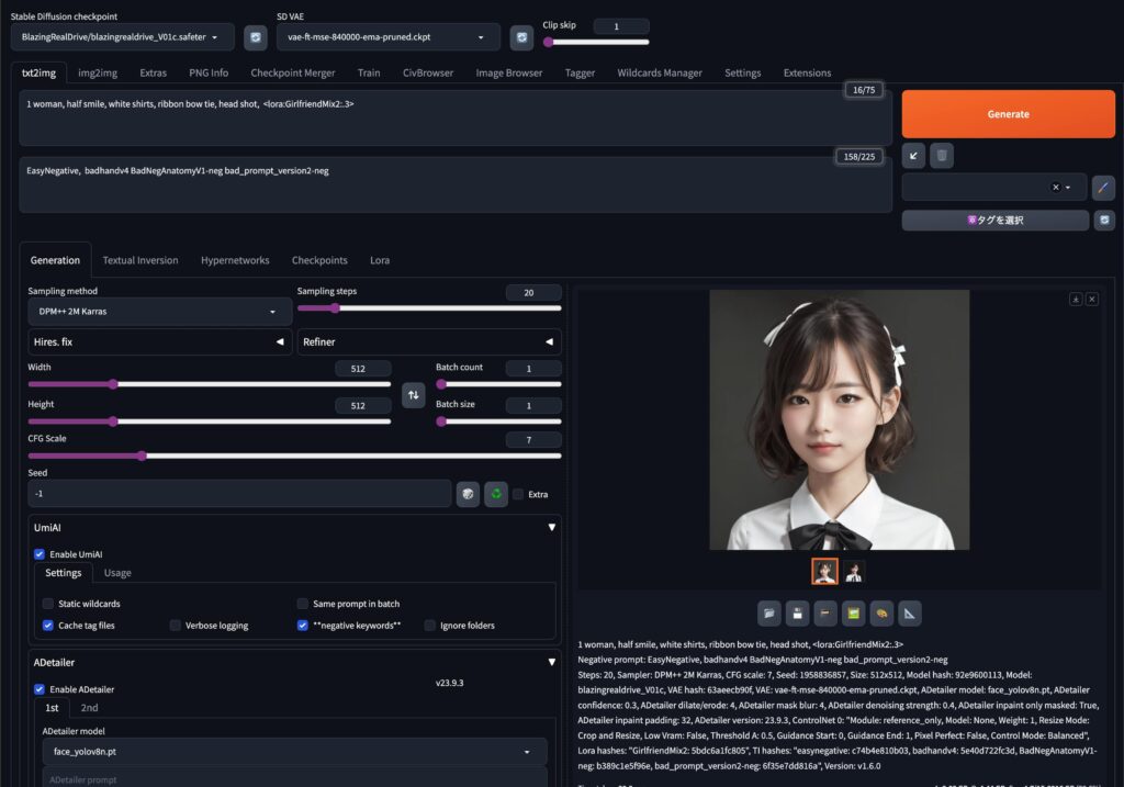 - 学習モデル: BlazingRealDrive_v01c(お好みのものを使用してください。)