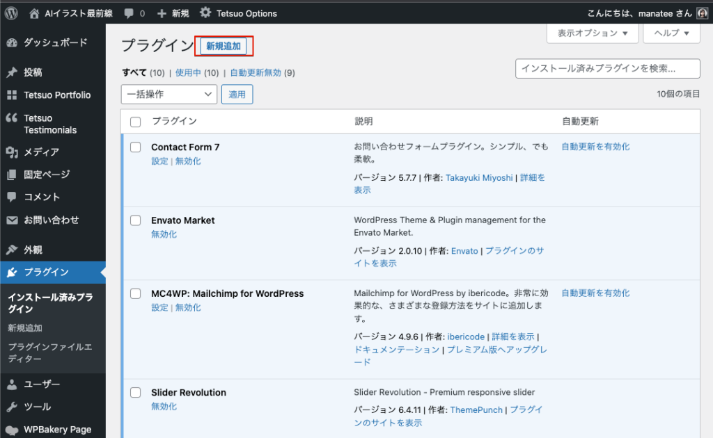 インストール済みプラグイン一覧が表示されますので、上部にある「新規追加」ボタンをクリックします。