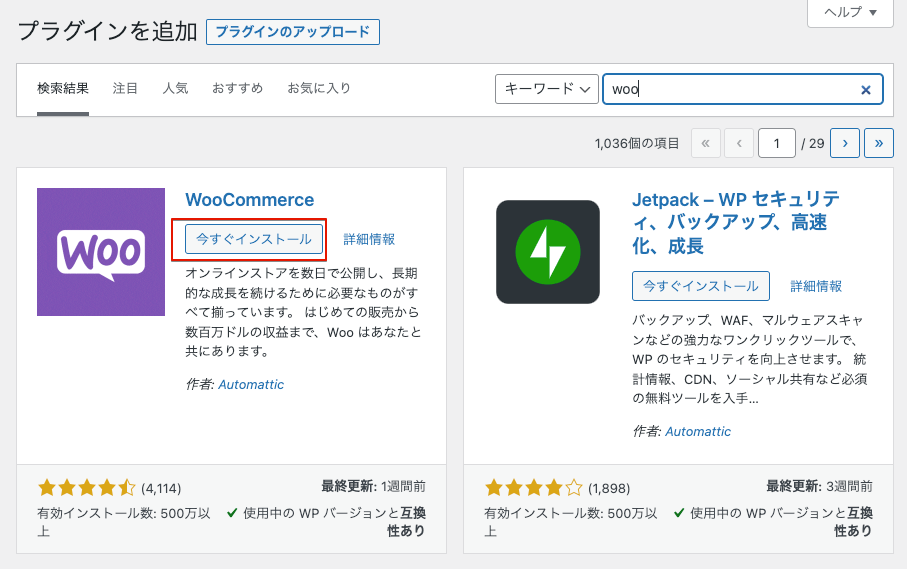 キーワードに「woo」を入力すると検索結果が表示されますので、以下のWooCommerceアイコンを見つけ、「今すぐインストール」ボタンをクリックしてください。