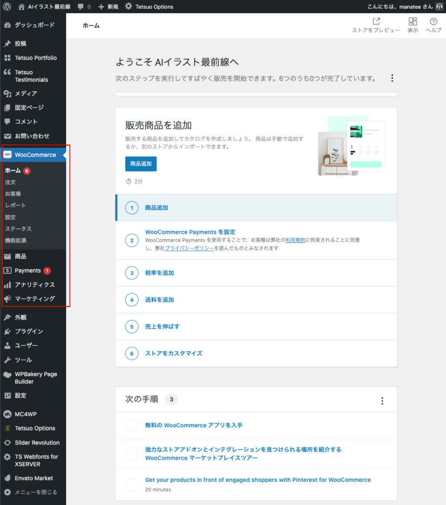 完了すると、左側のメニューにWooCommerceの設定メニューが追加されています。