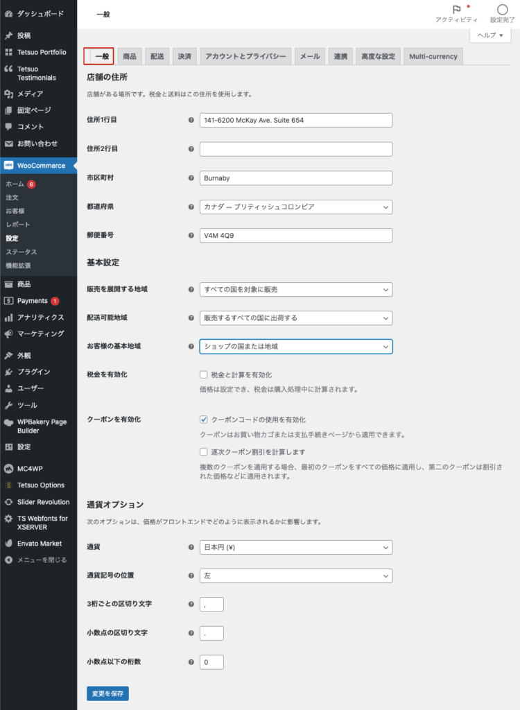 • 一般では、お店の住所、通貨オプションを設定します。