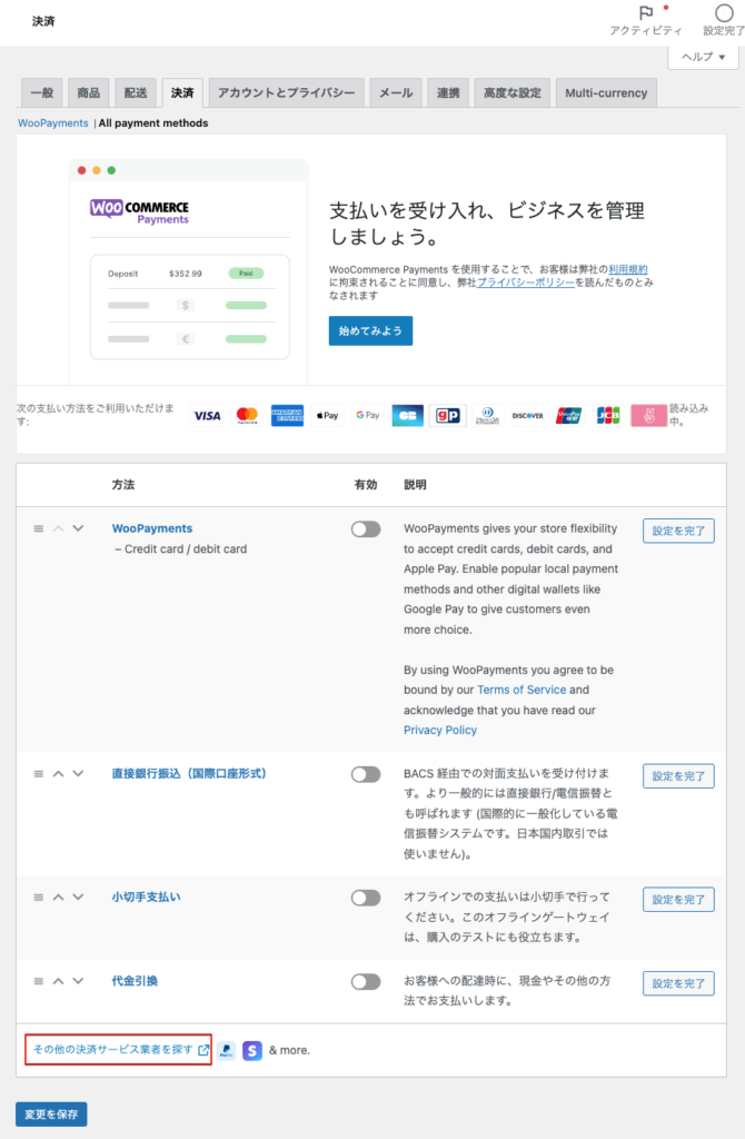 • WooCommerce Paymentsで支払いを受ける(決済サービスが別にない場合にはON)