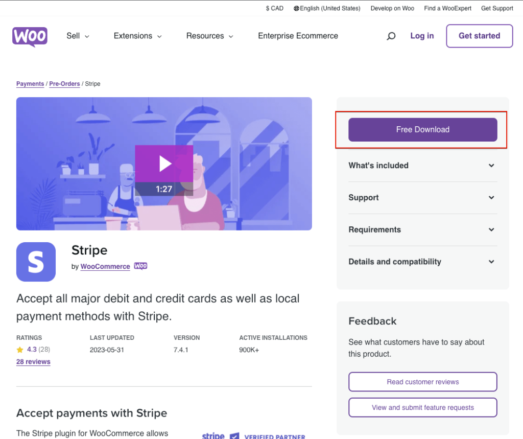 Stripe拡張機能は無料ですので「Free Download」をクリックします。