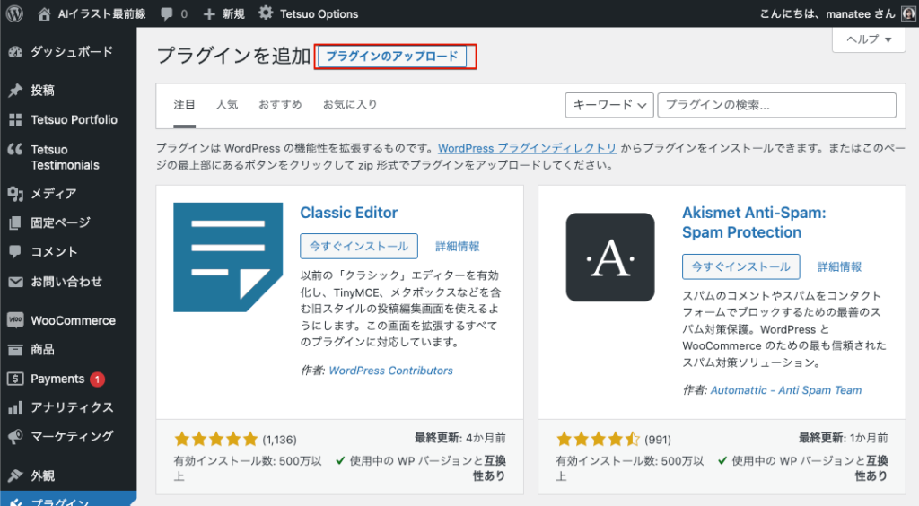 再度、WordPressのプラグインのインストール画面に進みます。