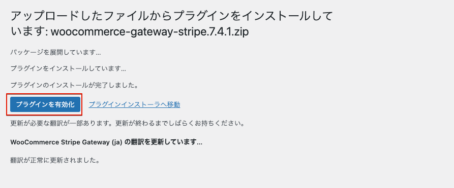 プラグインのインストールが完了すると有効化ボタンを表示しますのでクリックします。