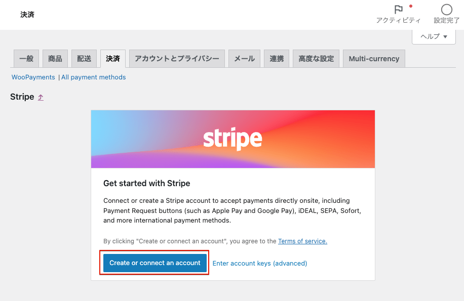 WooCommerceプラグイン設定画面の決済タブにStripeが表示されます。
