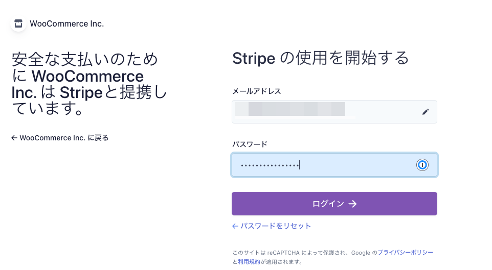 私の場合は、既にStripeアカウントがありますのでパスワードを入力し「ログイン」ボタンをクリックします。