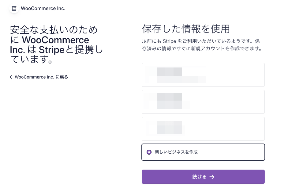 「新しいビジネスを作成」が選択されている状態になりますので「続ける」ボタンをクリックします。