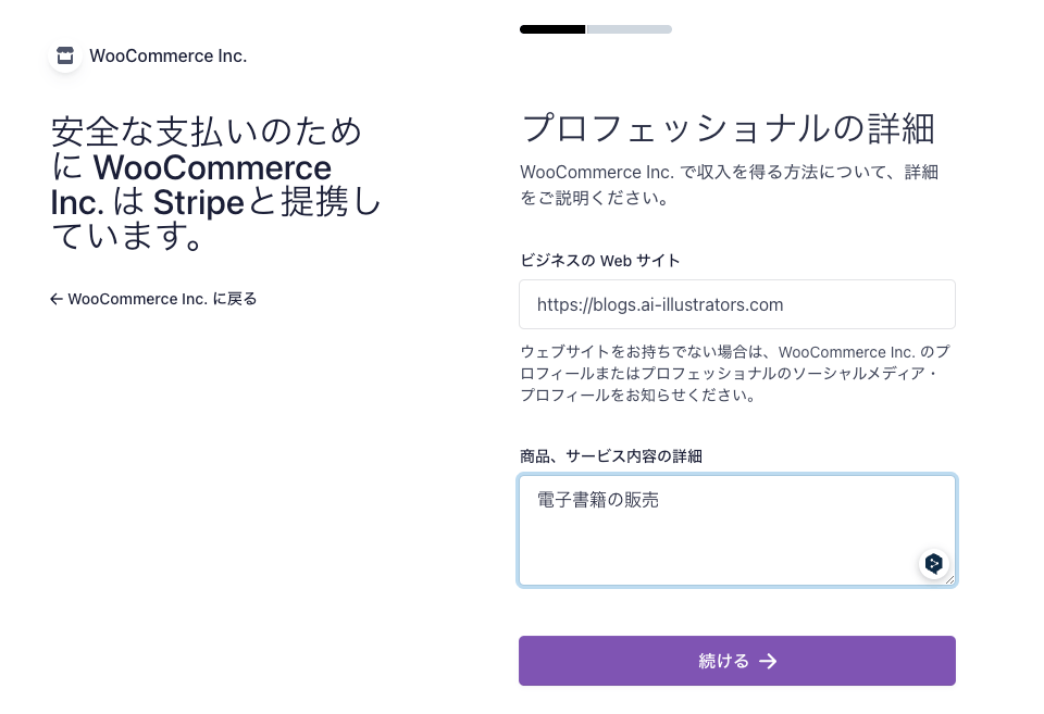 WebサイトのURLとサービス内容を入力し「続ける」ボタンをクリックします。