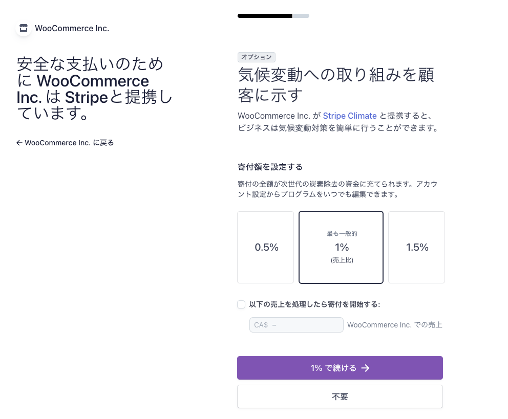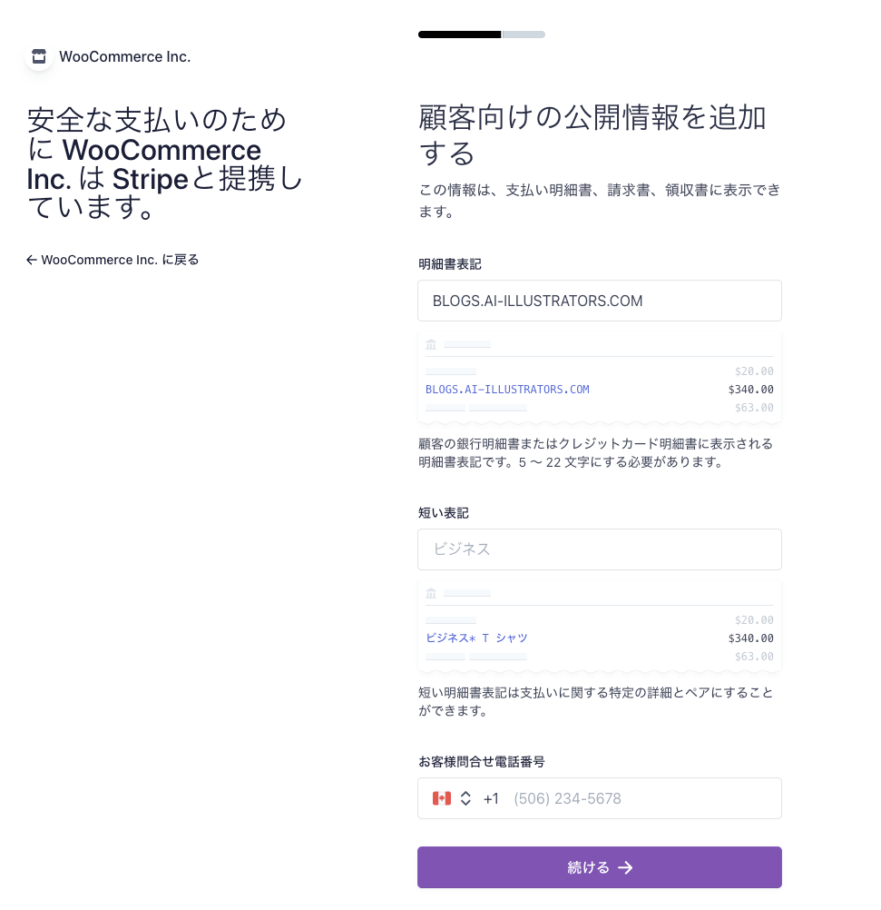 購入者のクレジットカード明細への表示を設定し、電話番号を入力後、「続ける」ボタンをクリックします。