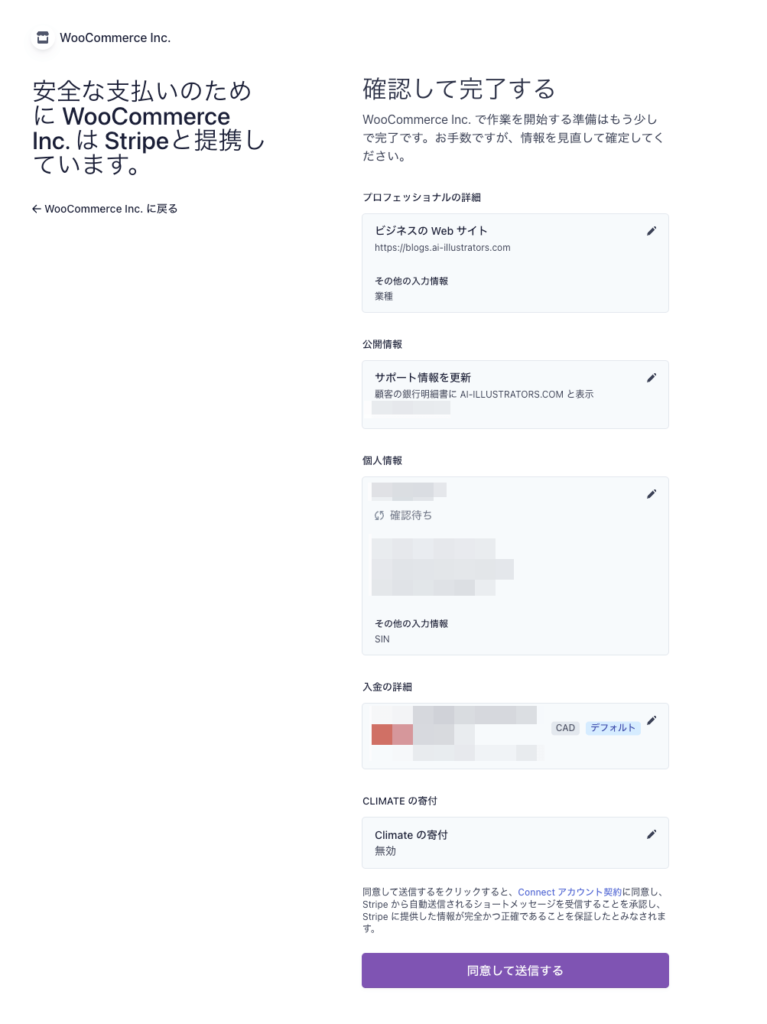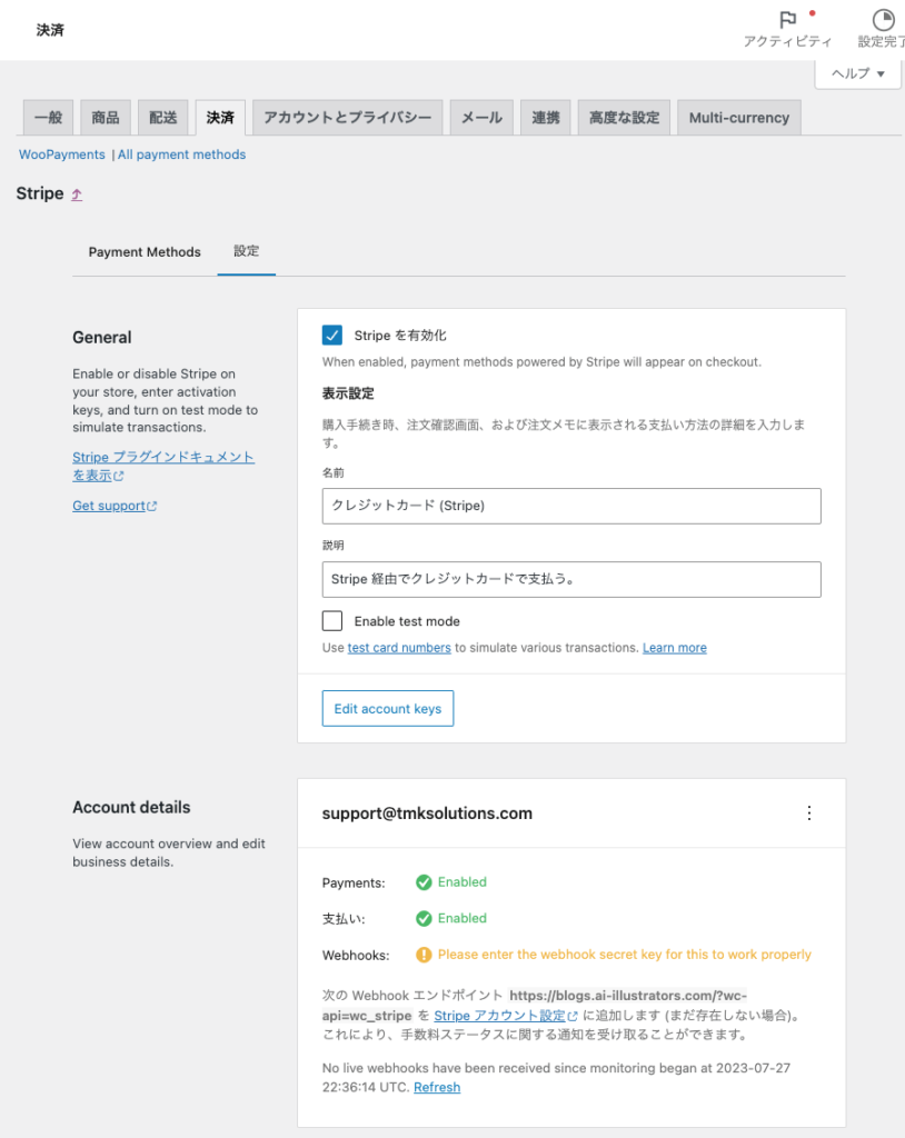 以上でWordPress側の設定は完了です。Stripeで承認されるとメールが届き、決済が出来る状態になります。