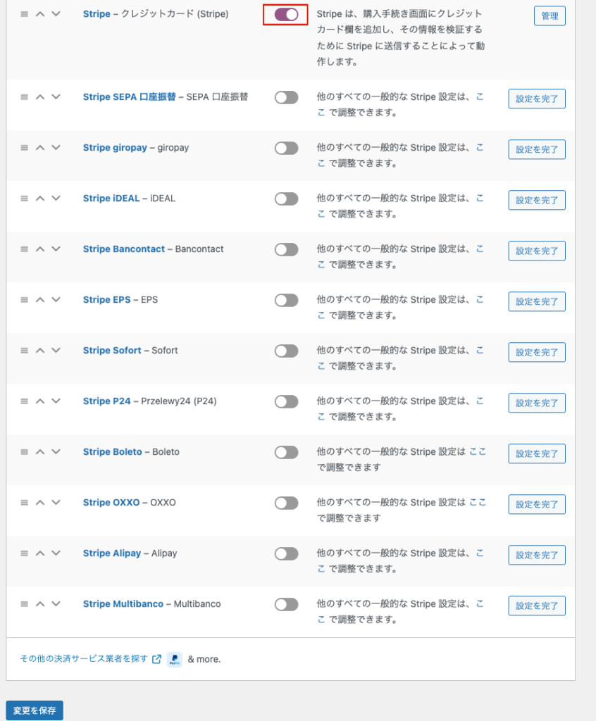 Stripe-クレジットカード(Stripe)のスイッチをONにします。