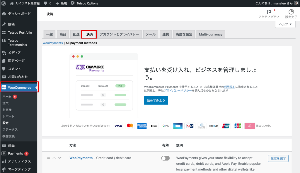 WordPressにログインし、左側のメニューから「WooCommerece」-「設定」をクリックし、「決済」タブを選択します。