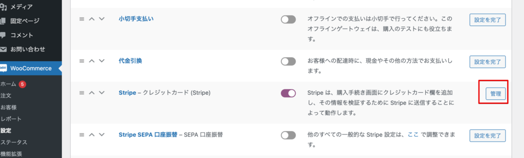 下へスクロールすると「Stripe-クレジットカード」がONになっているのを確認し、「管理」ボタンをクリックします。