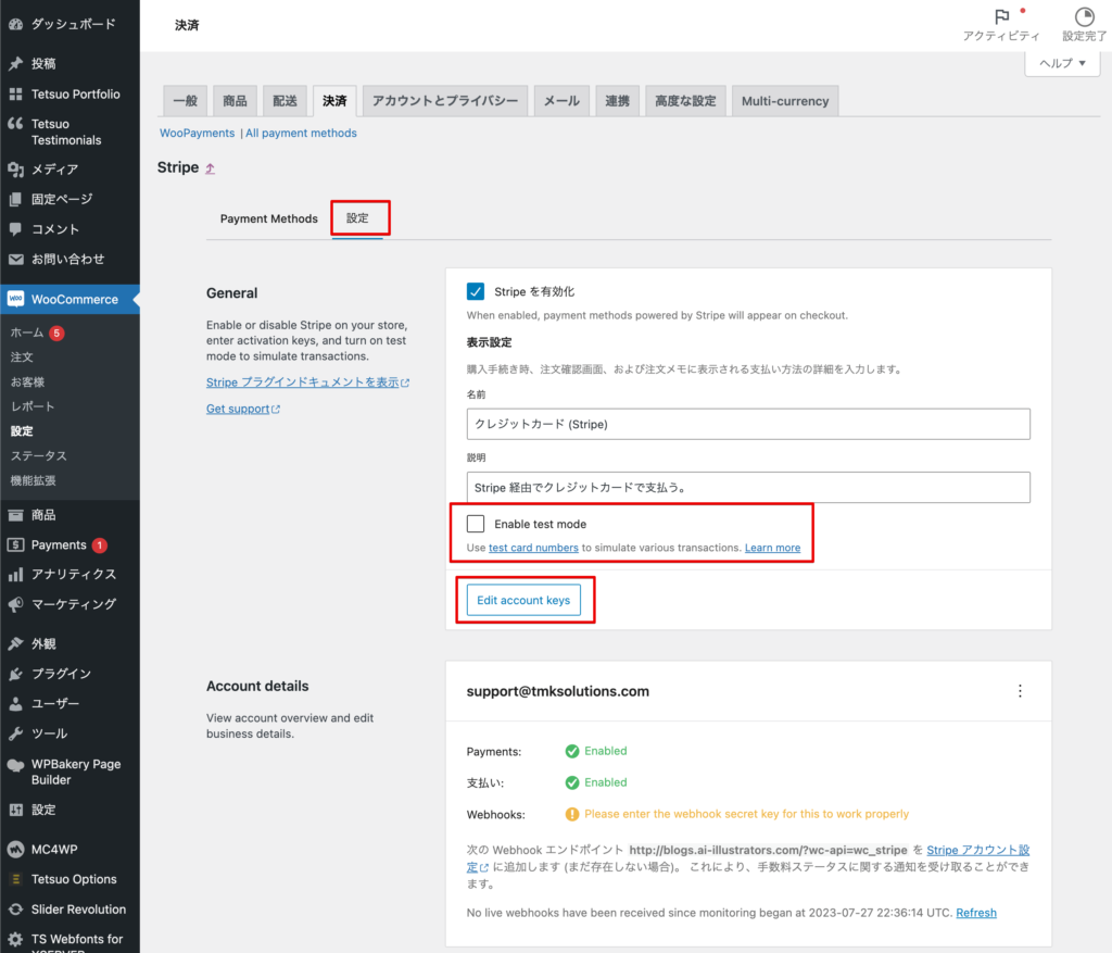 「Enable test mode(テストモード)」のチェックをONにし、「Edit account keys」ボタンをクリックします。