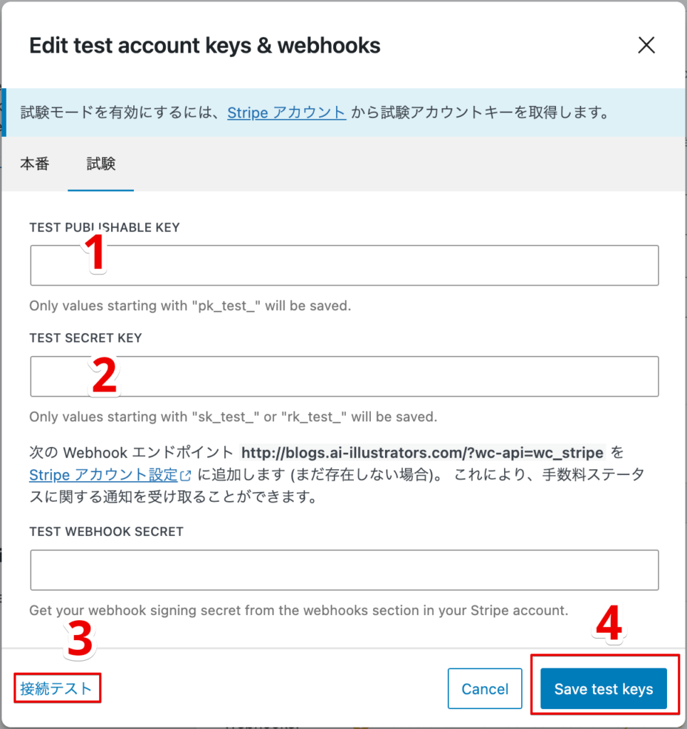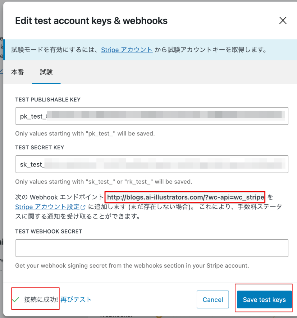 先ほどStripeダッシュボードでコピーしたキーを貼付け、「接続テスト」ボタンをクリックします。