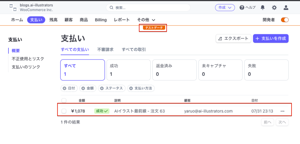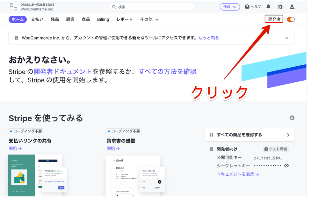 Stripeダッシュボードに戻り、「開発者」をクリックします。