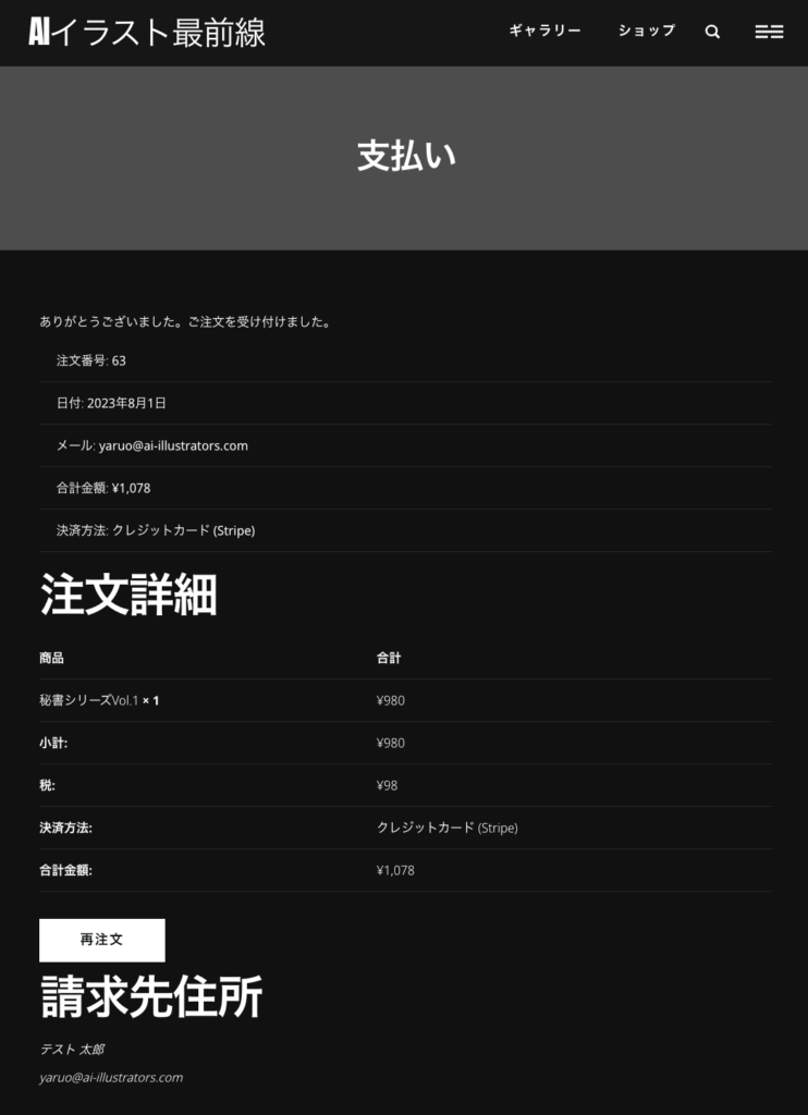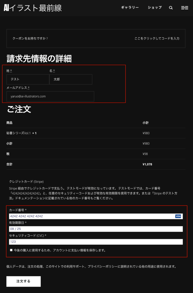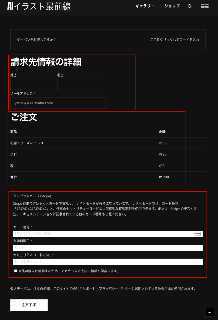 このサイトで販売するものはダウンロード商品で配送の必要がないため、住所などの入力欄を非表示にし、入力項目を最小限にします。