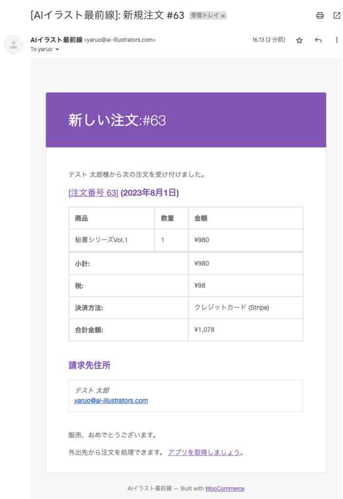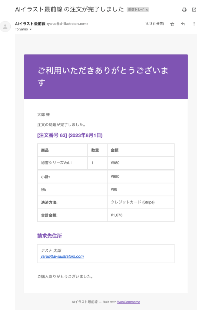 購入者には以下のメールが届きますが、WordPress左側のメニュー「WooCommerce」-「設定」で「メール」タブを選択し、それぞれのメールの文面を編集してください。