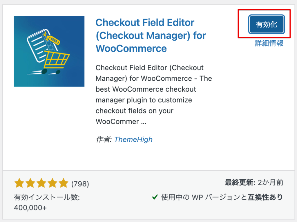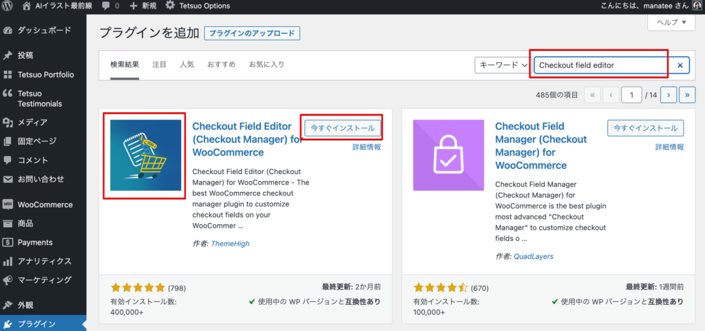 検索欄に「Checkout field editor」と入力し、以下のプラグインを探します。「今すぐインストール」をクリックしてインストールします。