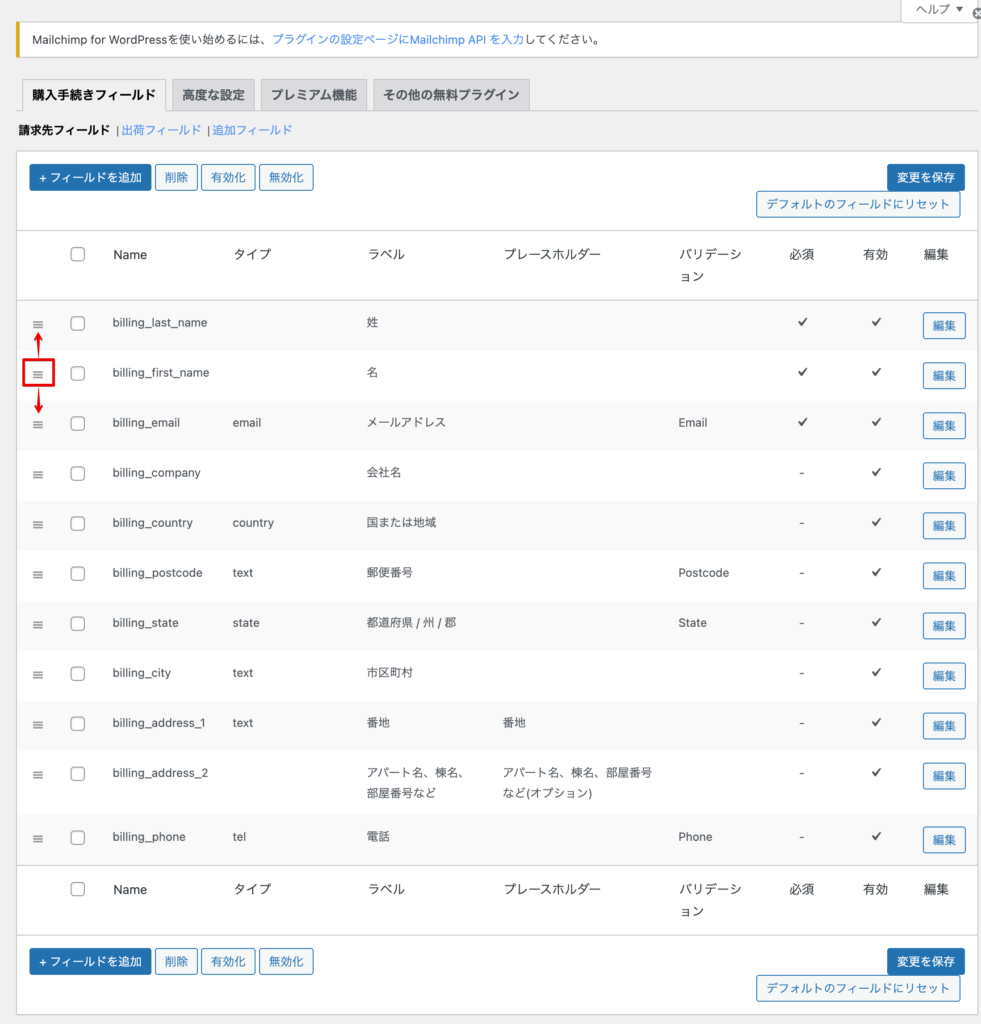 入力項目が表示されますので、一番左のアイコンをドラッグし、「姓、名」のように順番を変更します。