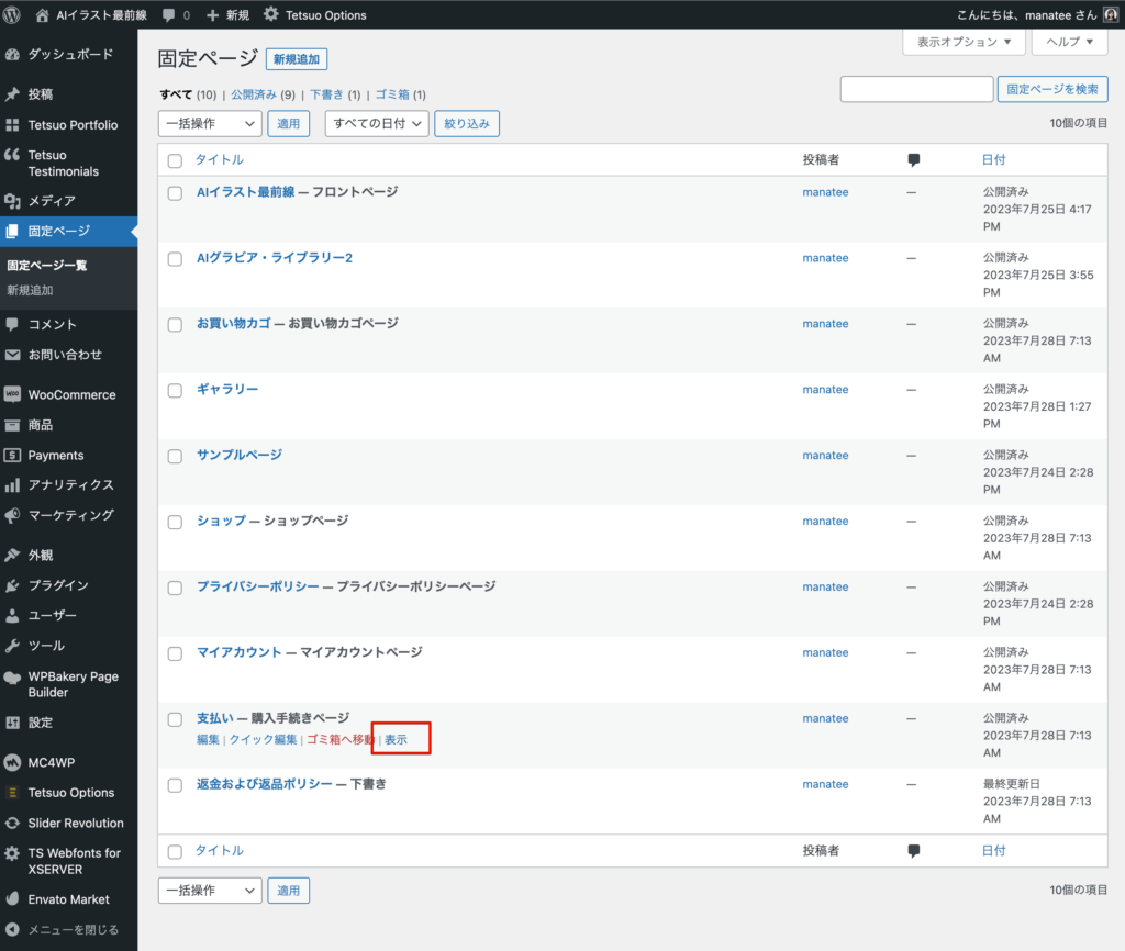 WordPress左側のメニュー「固定ページ」を選択します。WooCommerceのインストールで追加されている「支払いページ」の「表示」をクリックします。