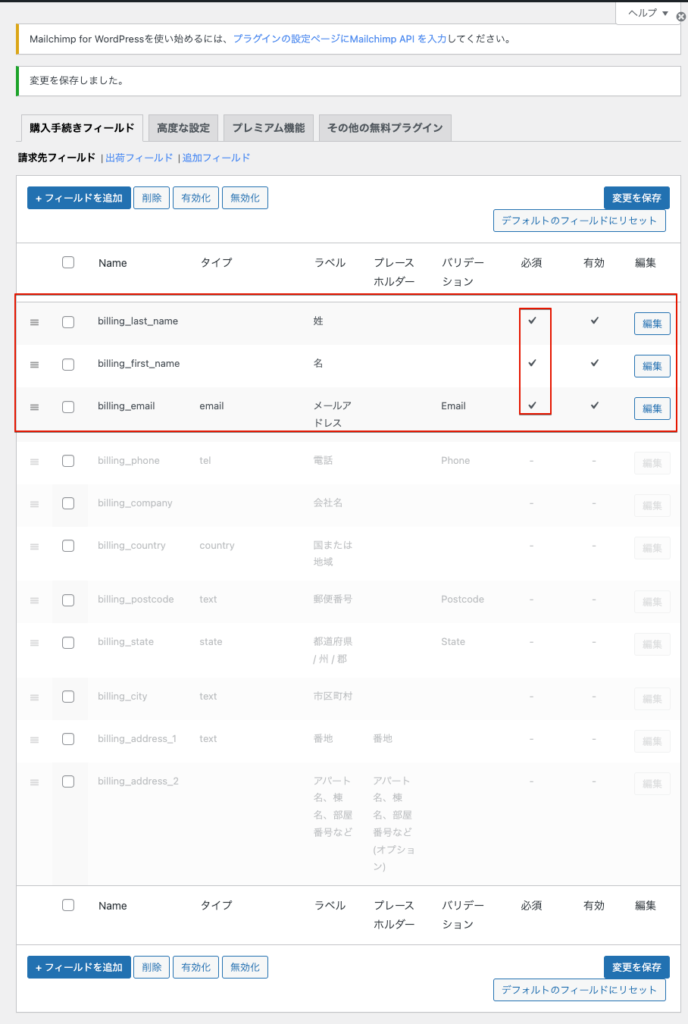 入力項目は、「姓、名、メールアドレス」のみにしています。また、「追加フィールド」タブにある「注文メモ」も無効化しています。