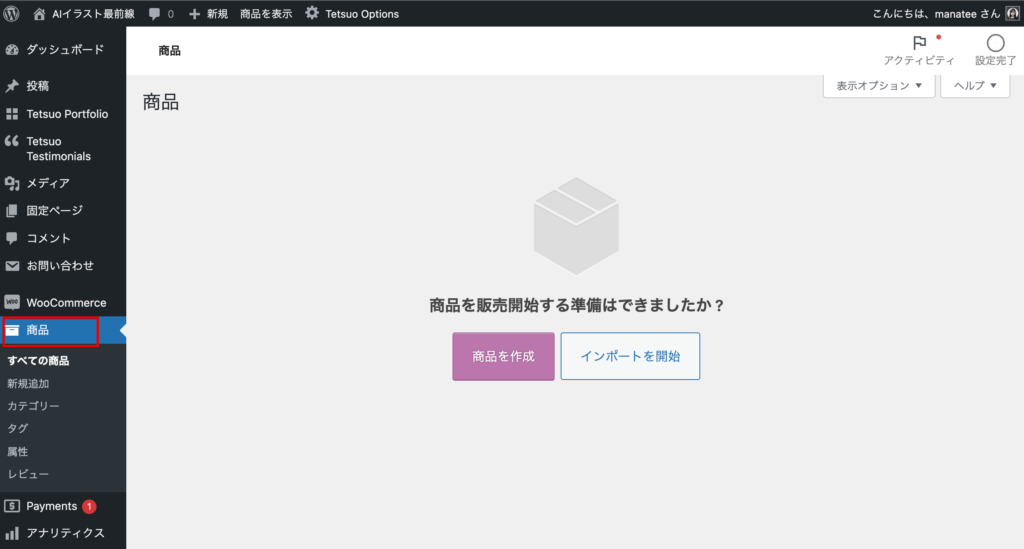 WordPress左側のメニュー「WooCommerce」−「商品」を選択します。「商品を作成」ボタンをクリックします。