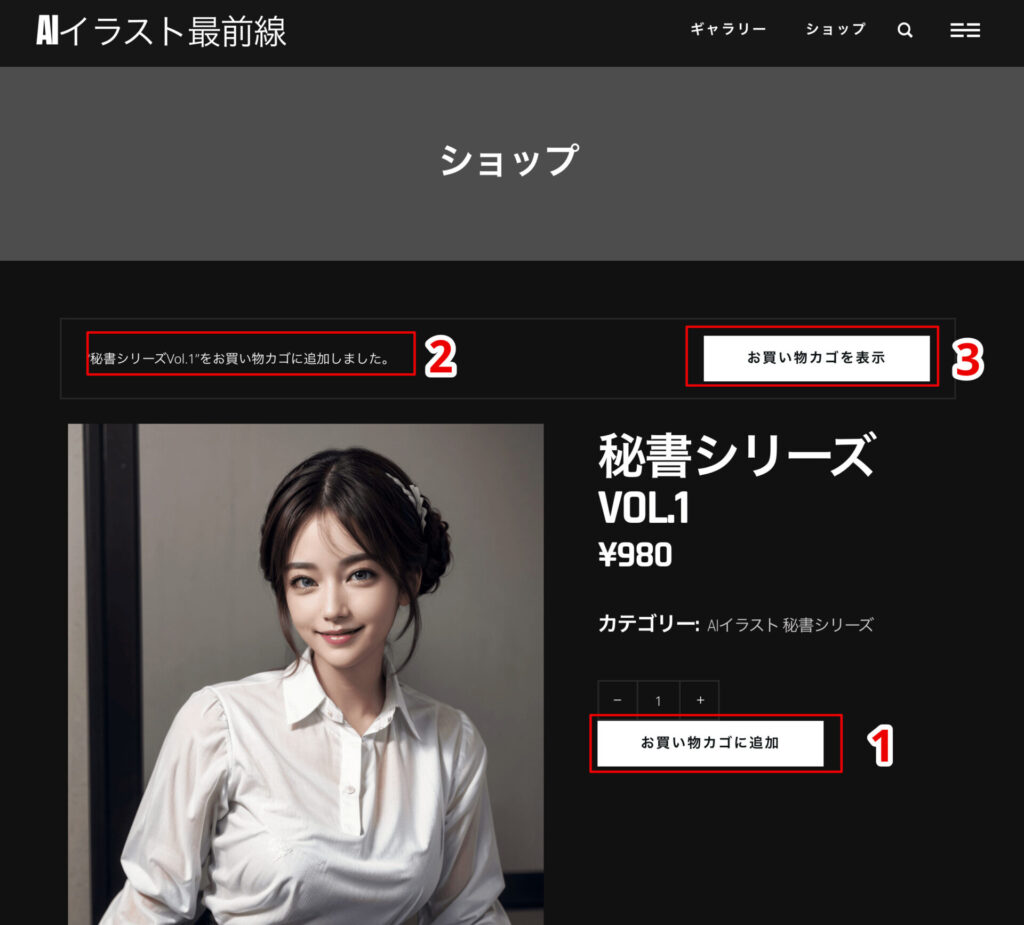 商品をクリックすると、商品詳細ページを表示します。「買い物カゴに追加」ボタンをクリックするとカートに追加されます。