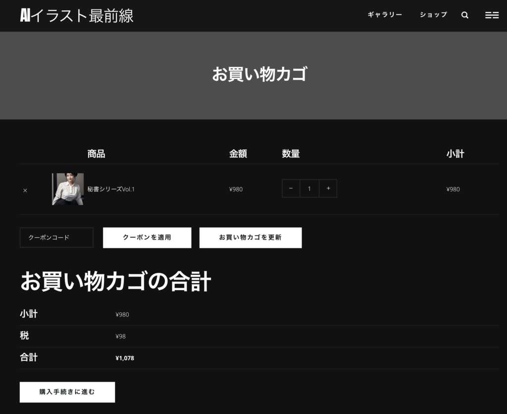 「買い物カゴを表示」をクリックするとカート内の商品が表示されます。「購入手続きに進む」ボタンで支払いページへ進みます。